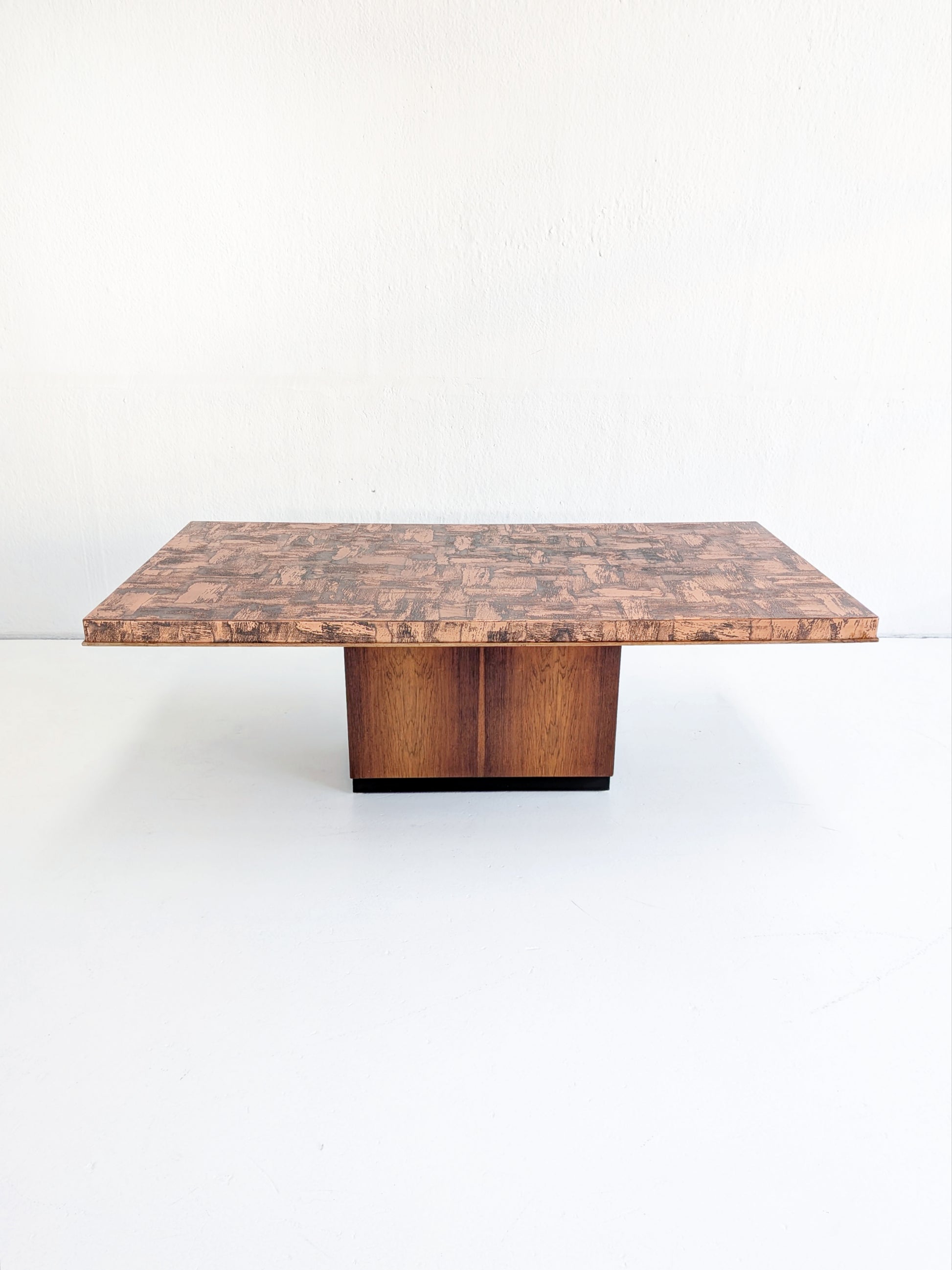 Rectangular brutalist coffee table by German designer Heinz Lilienthal, featuring a palissander wood base and a copper top. The top shows beautifully detailed etching.