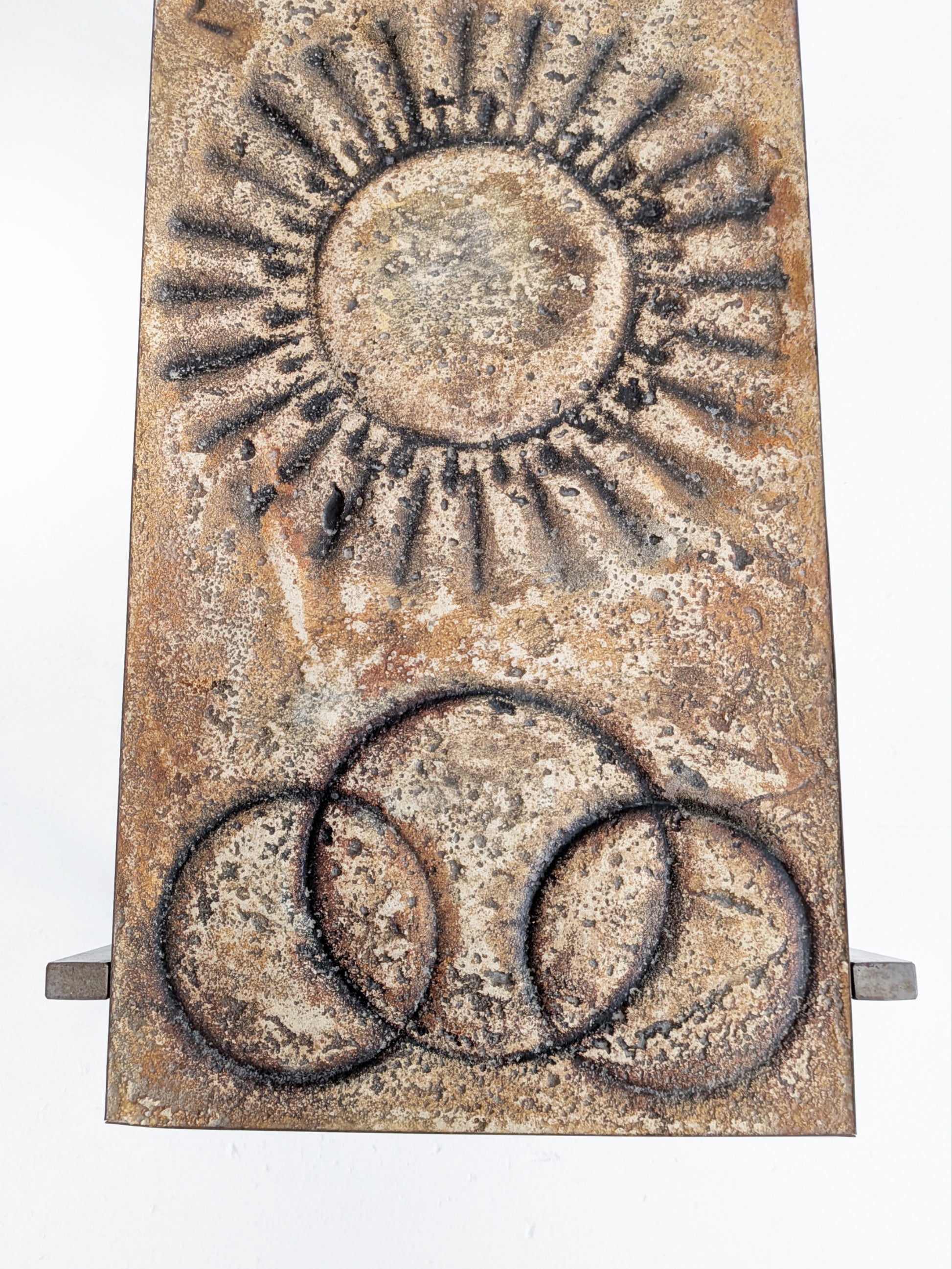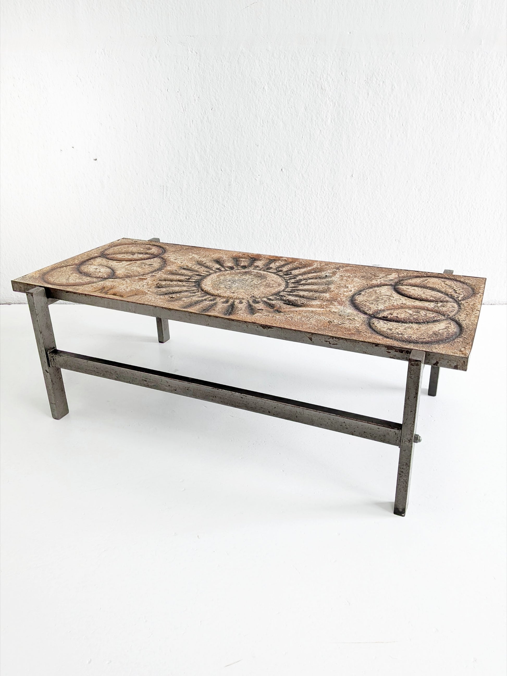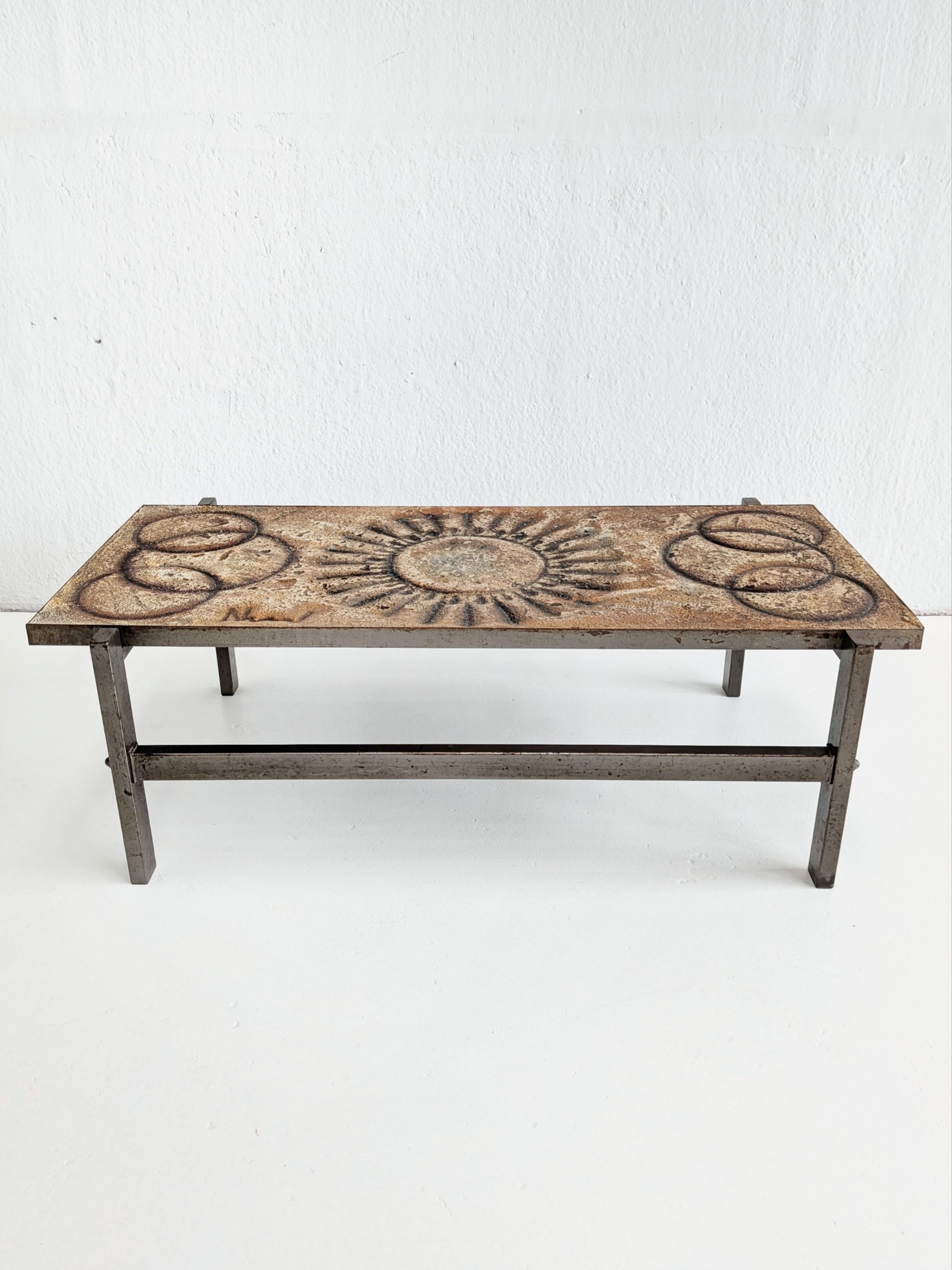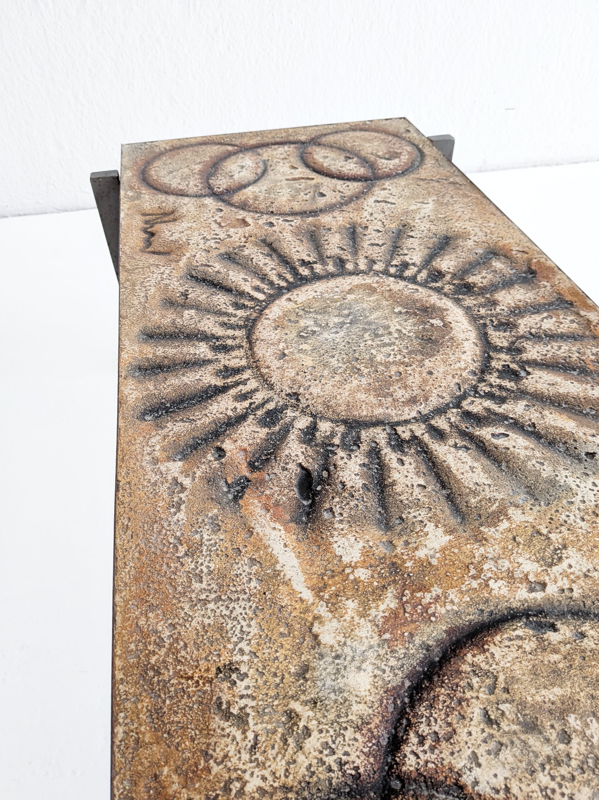Rectangular lavastone coffee table with metal base, designed by François Chaty for Vallauris, 1960s. The top, which is signed by the artist, is separate from the base, making the table easier to transport.