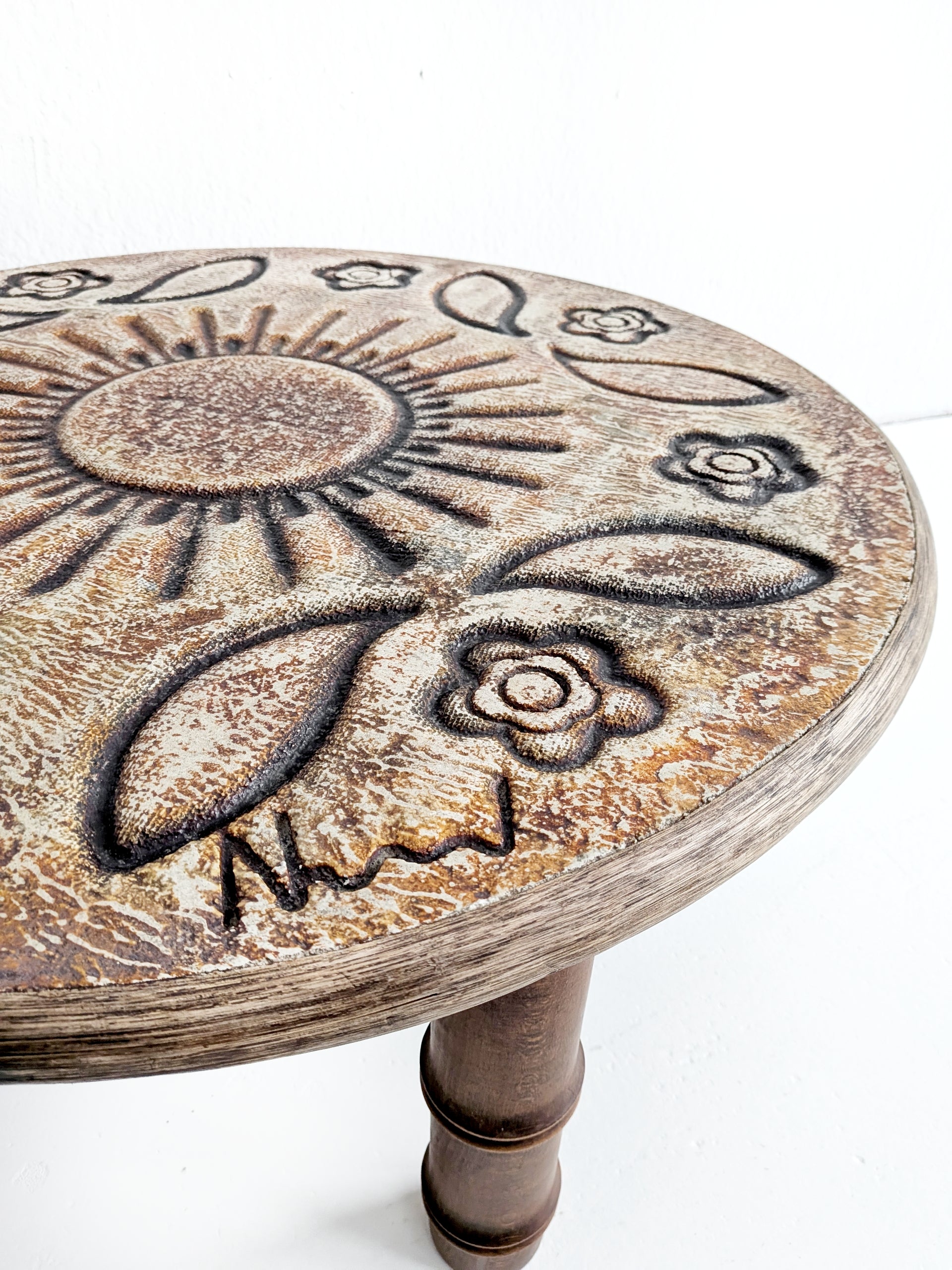 Round lavastone coffee table with wooden base, designed by François Chaty for Vallauris, 1960s. The top is signed by the artist.