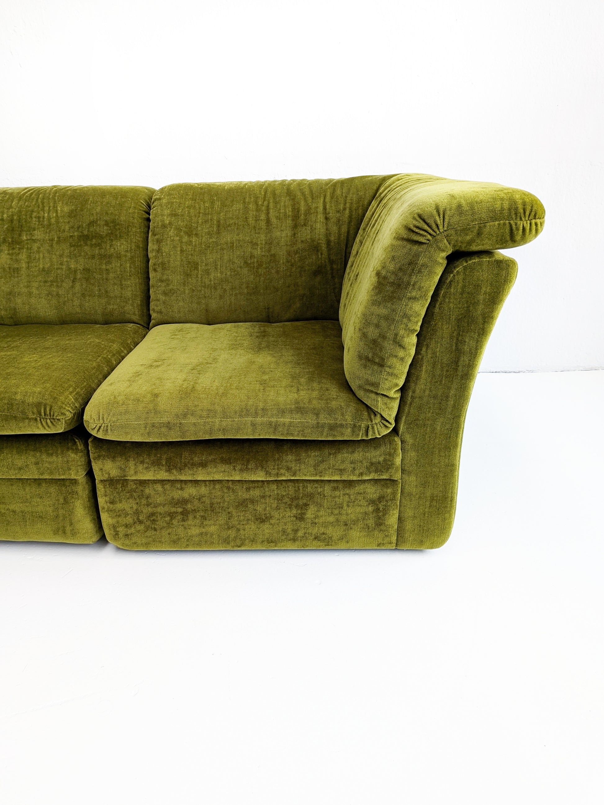 Seventies modular sofa in a moss green velvet fabric. The sofa consists of 5 pieces; 3 individual seats & 2 corner elements. It is fully modular, meaning it can be installed whichever way you like and according to your personal needs & desires.