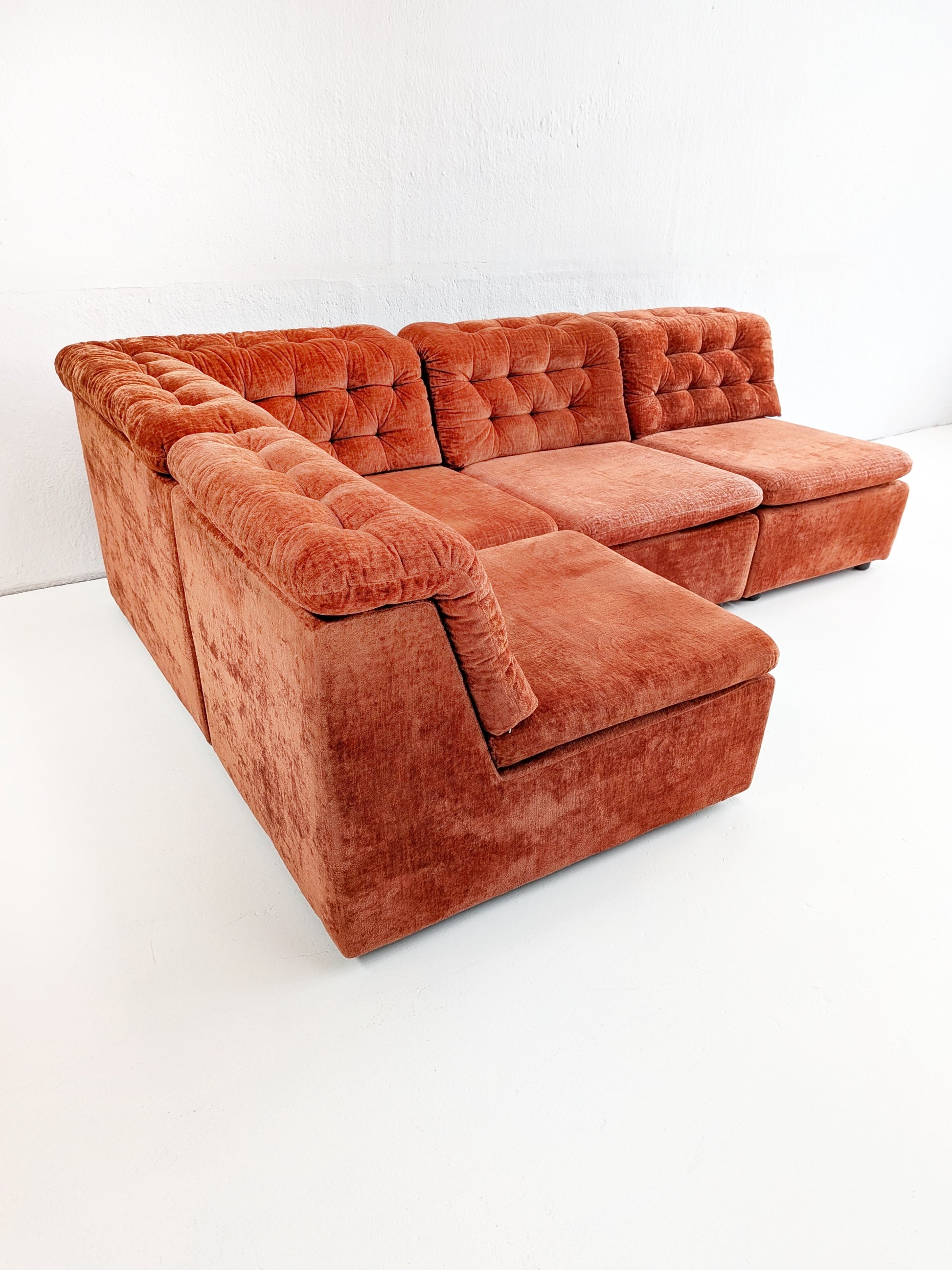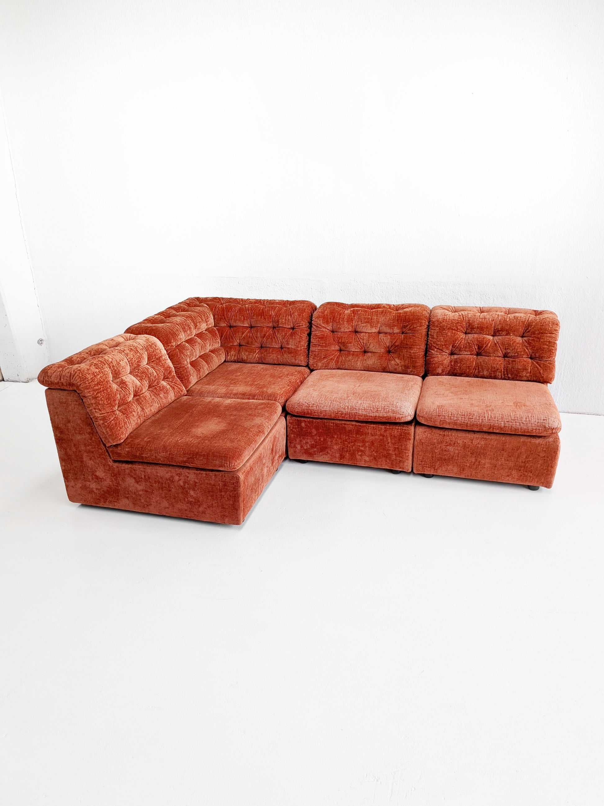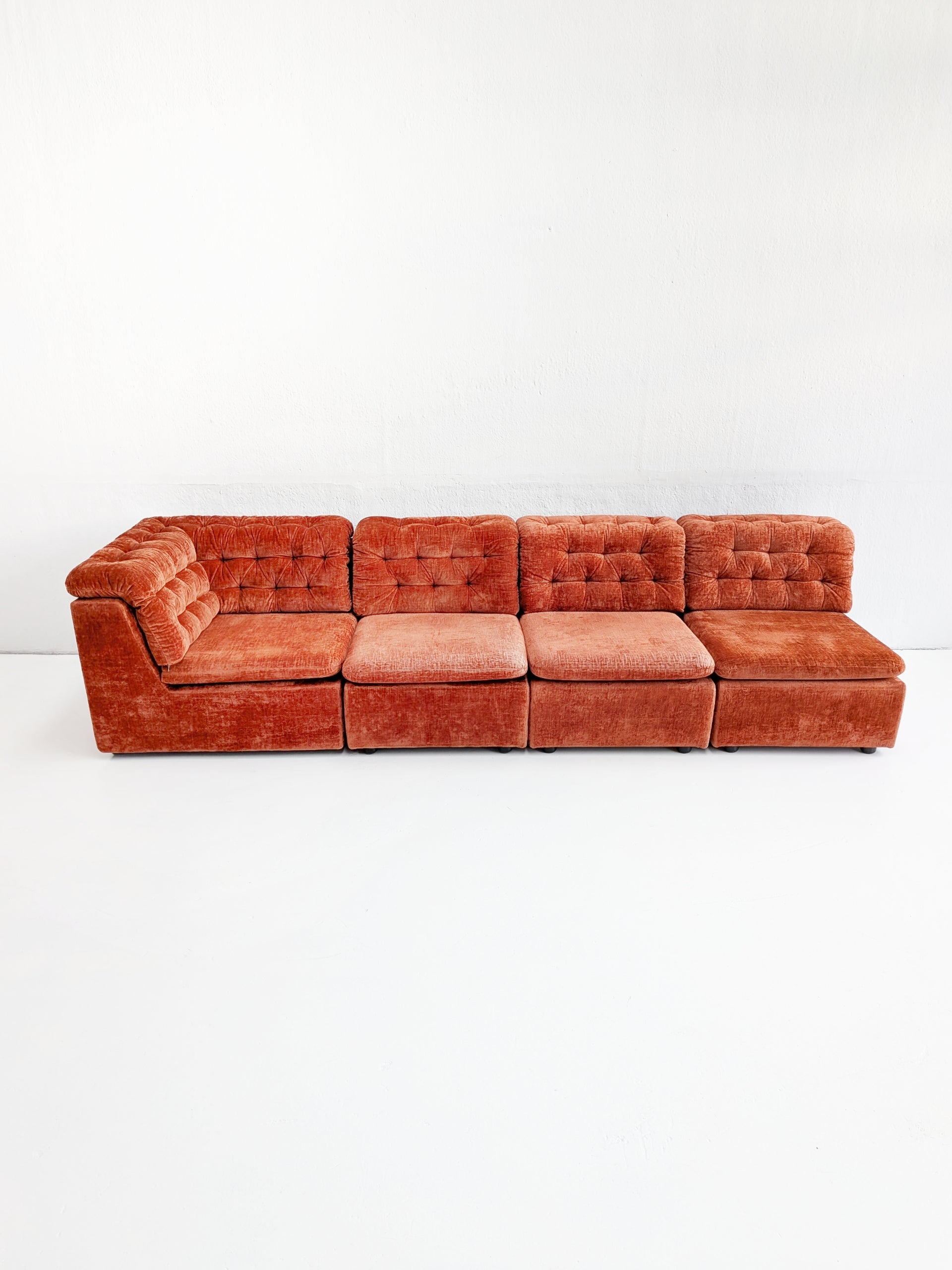 Seventies modular sofa in a brick orange velvet fabric. The sofa consists of 4 pieces; 3 individual seats & 1 corner element, of which the cushions are all equipped with a zipper closing, so they can be easily removed to be washed.