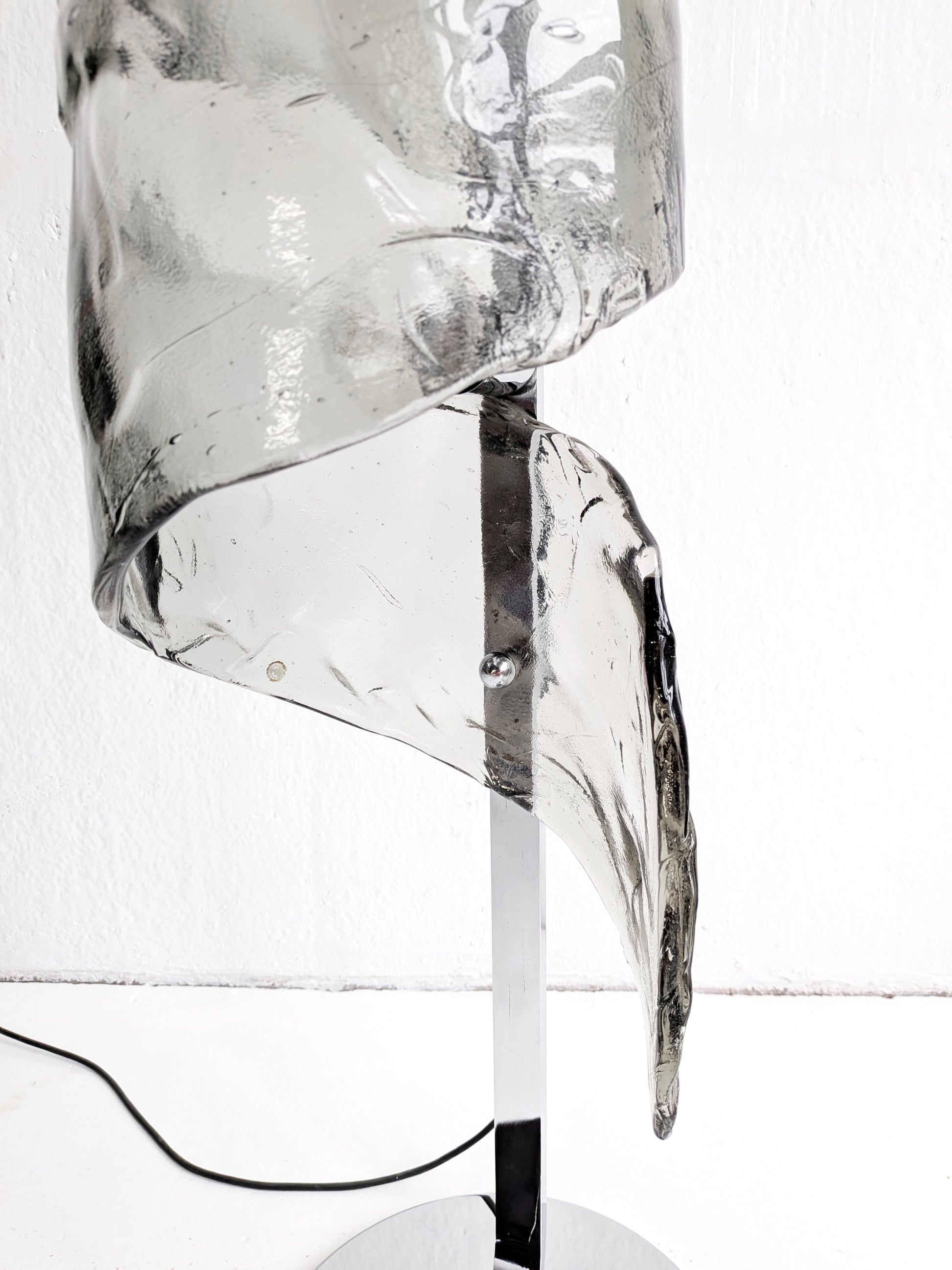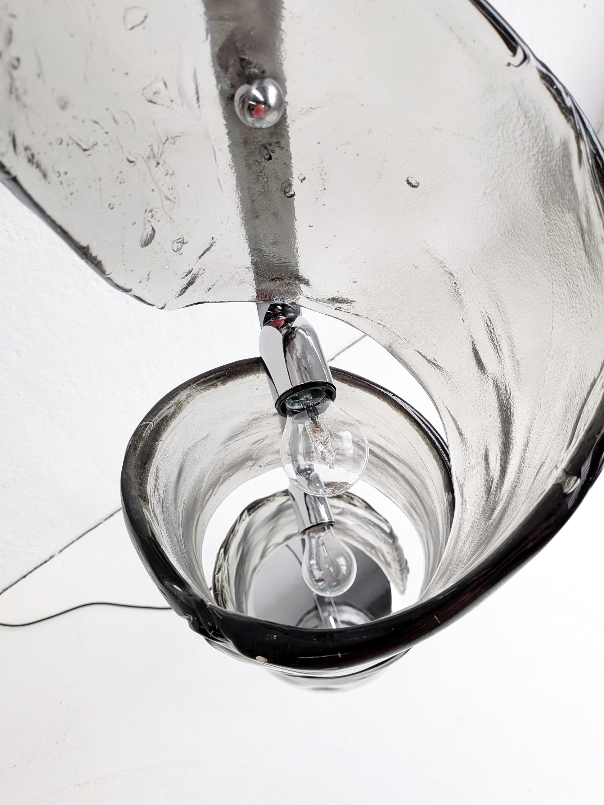 Vintage Space Age floor lamp from 1970s Italy, with a chrome base and a dark grey, murano glass spiral top. The lamp has a foot switch to be turned on and off and features two light points.
