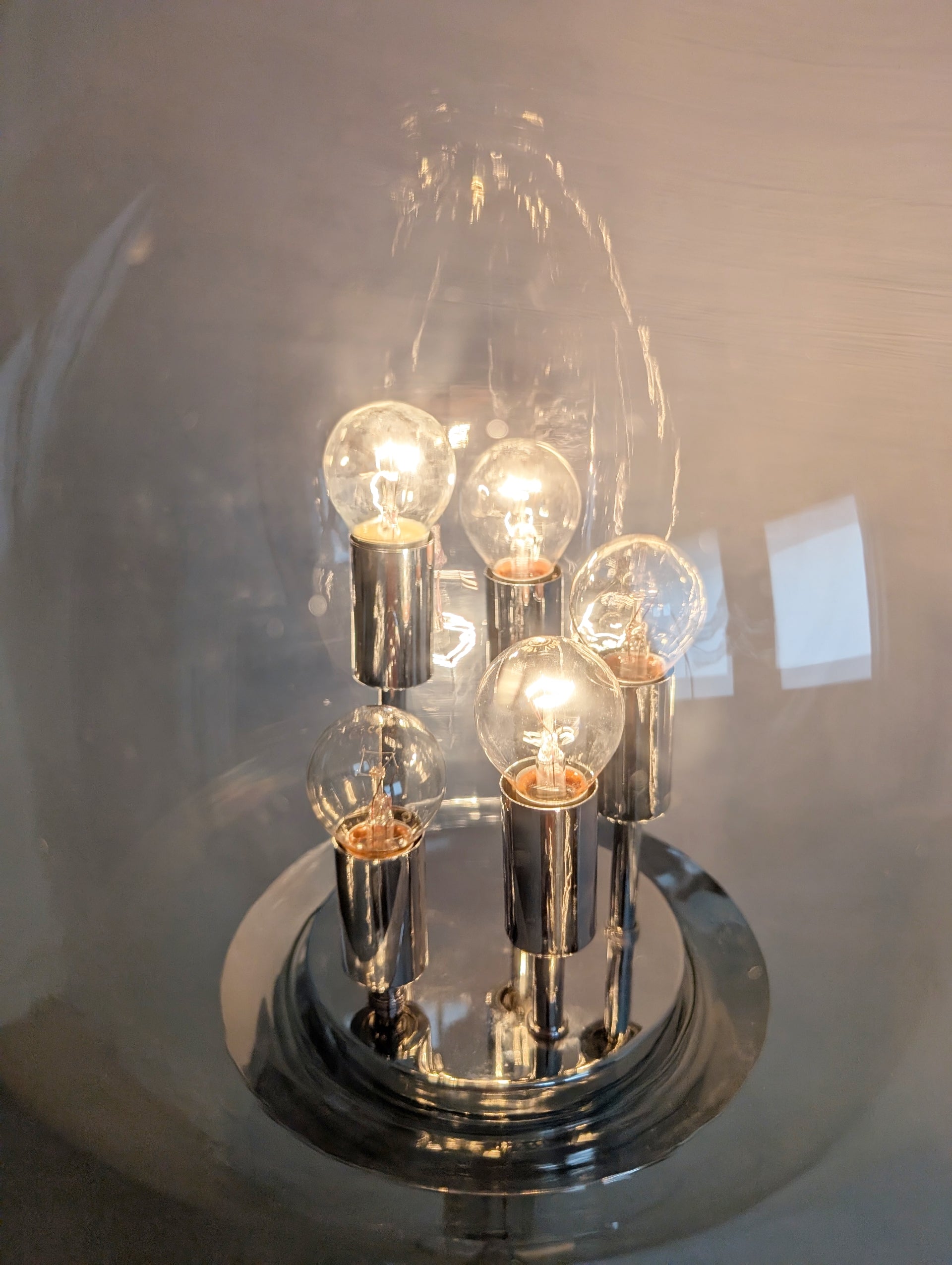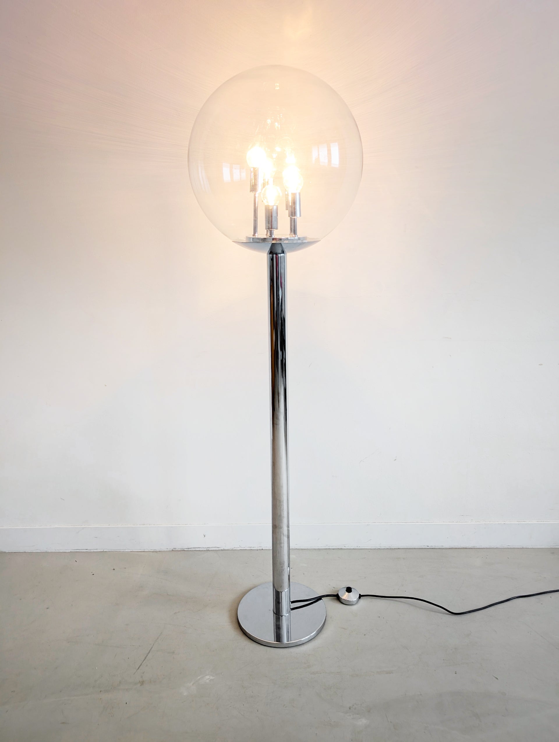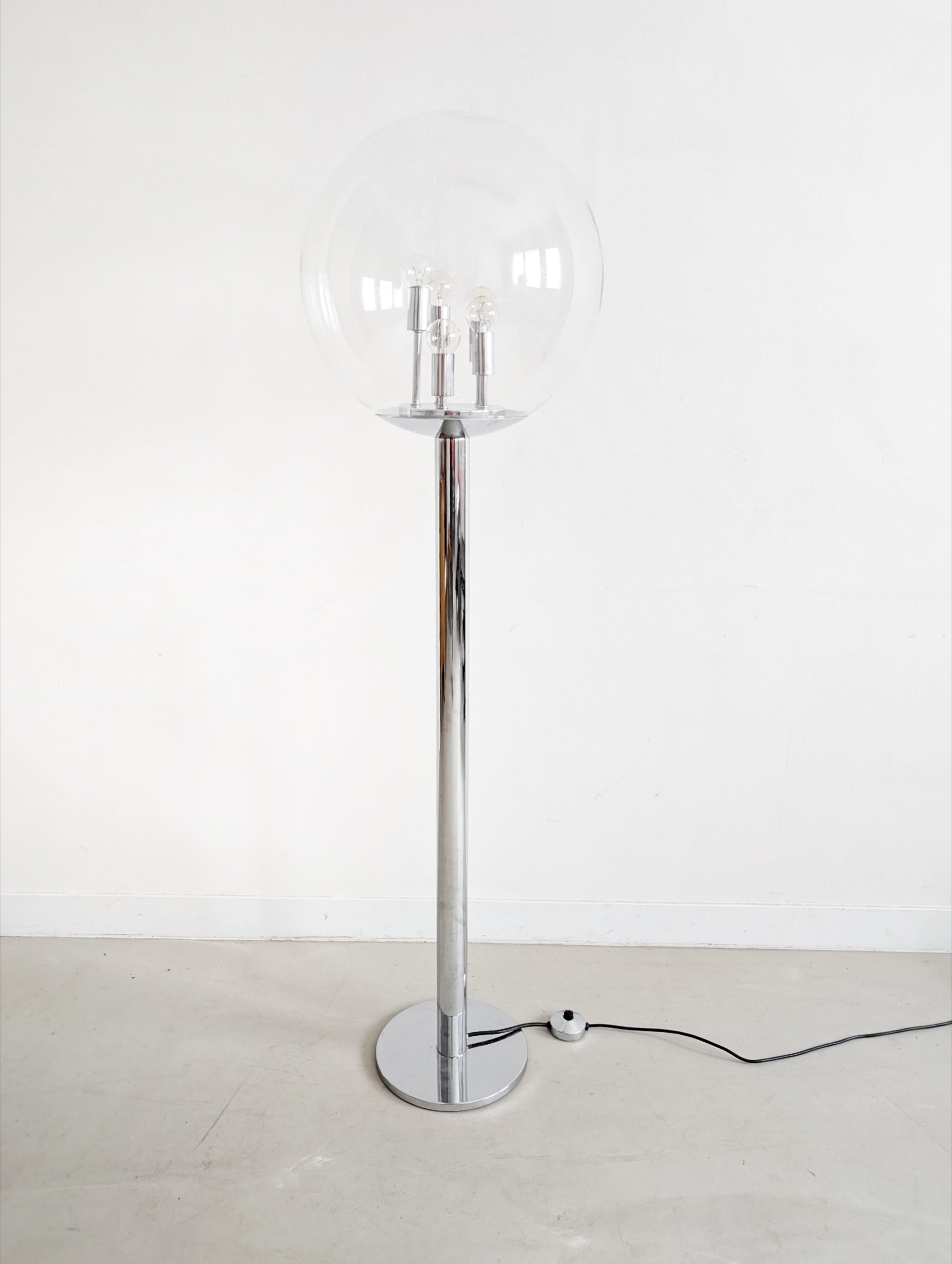 A real vintage statement piece for your interior, in the ever so popular Space Age style, with a sturdy chrome base and glass sphere on top. Operated with a foot switch, this lamp has 3 settings to create the perfect ambiance. stars